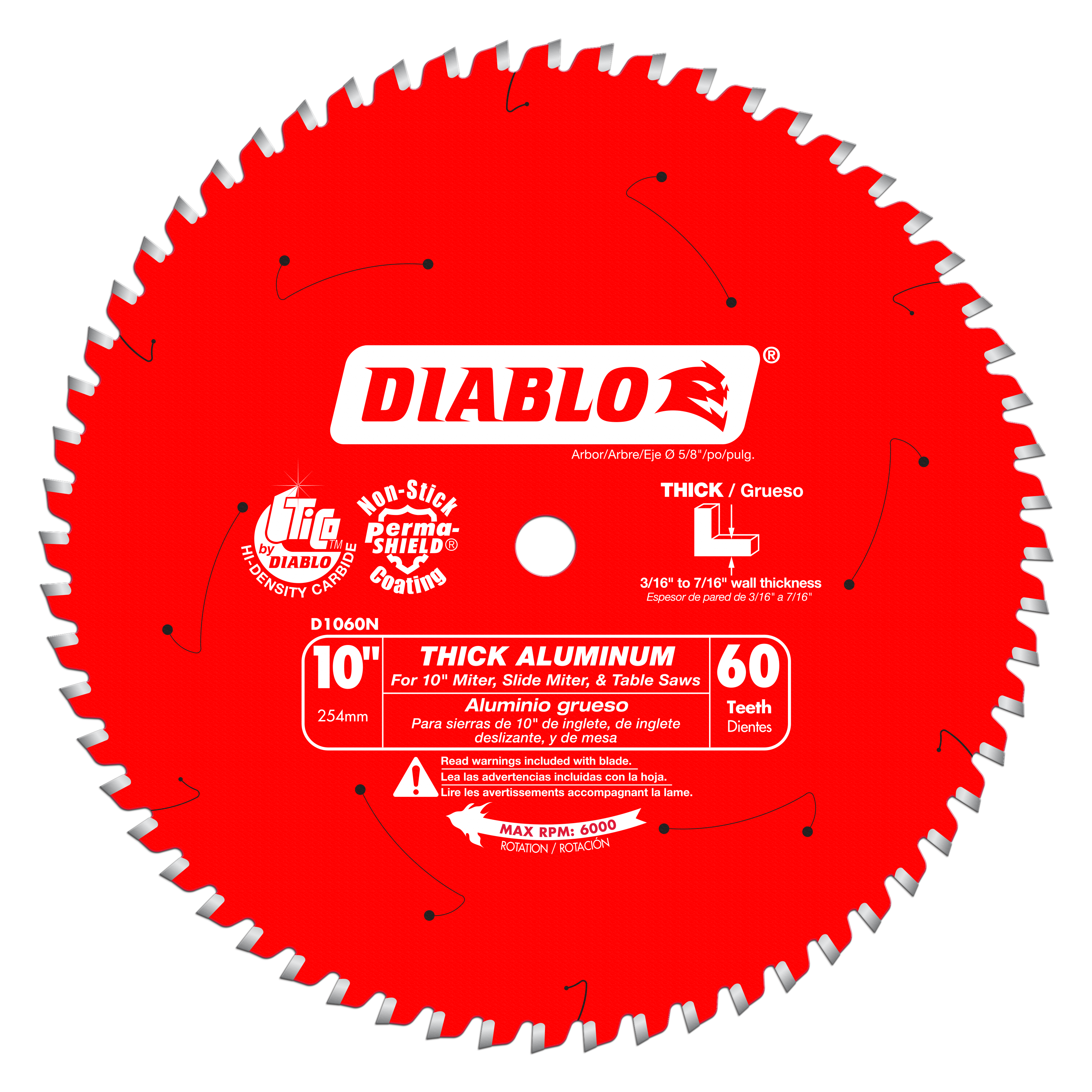 Diablo's next generation Saw Blades for Thick Aluminum are optimized for cutting thin (up to 1/8”), medium (3/32”-1/4”) and thick (3/16”-7/16”) aluminum metals. Featuring the new, specially formulated Diablo TiCo™ Super-Density Micro-Grain Carbide, these radical blades withstand impact, reduce wear, provide clog free cuts and last longer than standard carbide in metal cutting applications. The specially formulated metal cutting carbide teeth feature a Triple Chip Grind (TCG) Tooth Design for clean, burr-free finishes, virtually eliminating any type of rework. Tri-Metal Shock Resistant Brazing allows these Aluminum blades to slice through metal materials while withstanding extreme impact for maximum durability. Diablo's Aluminum saw blade series is ideal for corded and cordless saws when on-the-job cutting non-ferrous metals such as aluminum extrusions, copper pipe, brass plate, etc.