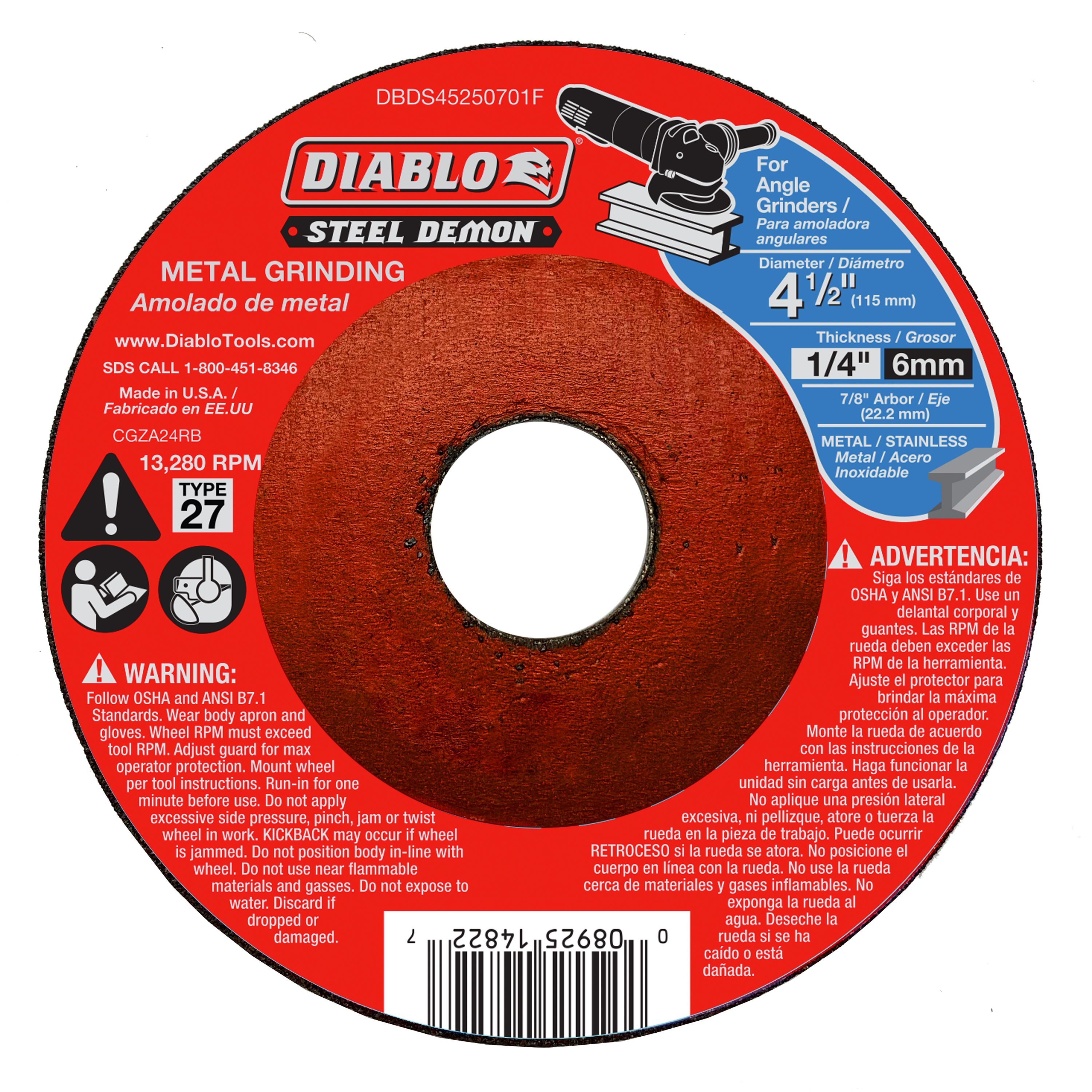 Diablo's Steel Demon™ metal grinding discs deliver industrial performance, increased productivity and longer grinding life. Featuring a premium ceramic blend that that delivers up to 6X longer life. A fully reinforced depressed center enables the disc to withstand heavy-duty metal grinding. These discs are ideal for working in hard-to-reach areas.