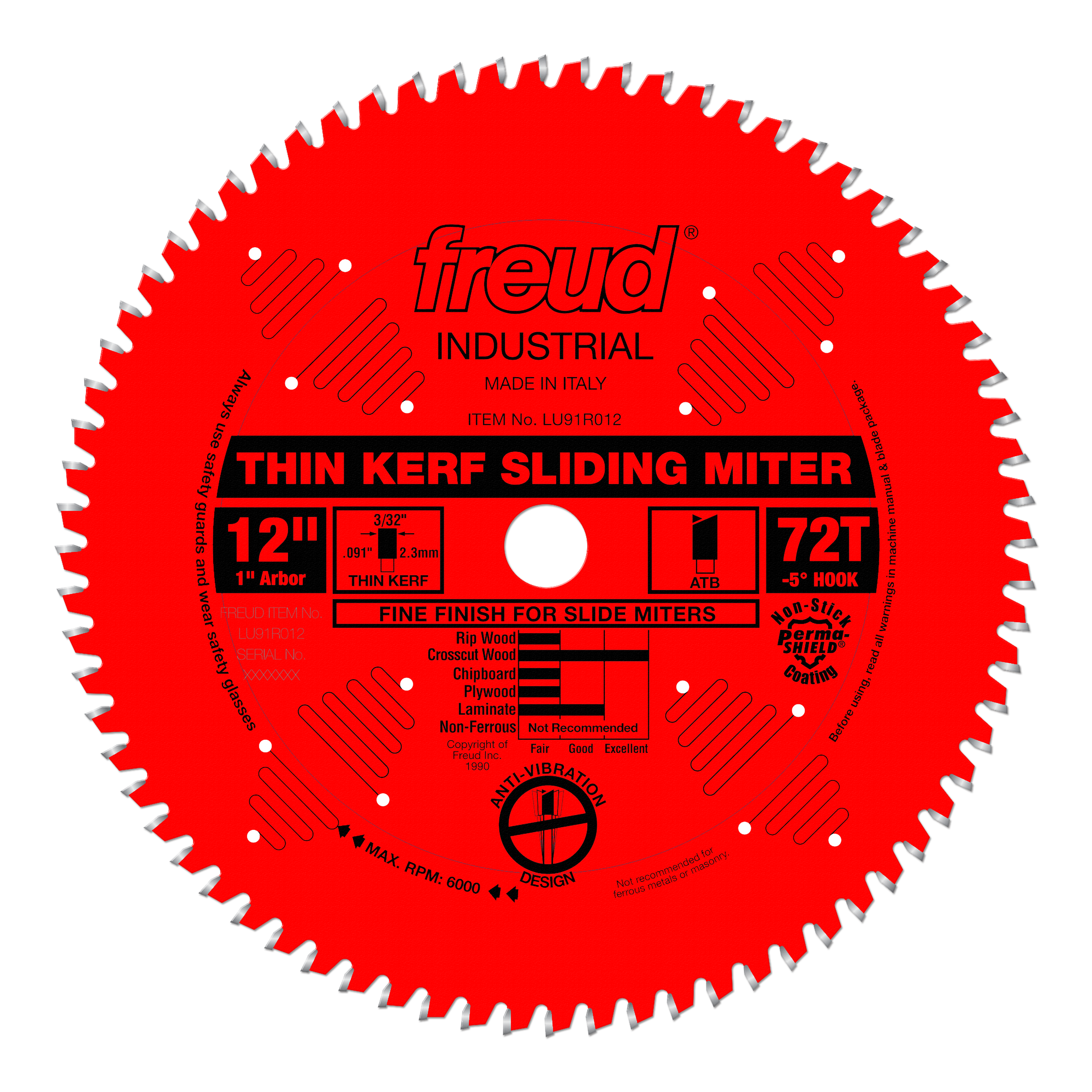 This thin kerf industrial blade provides a superior finish cut with sliding compound miter saws. The 5° negative hook angle helps prevent the blade from being too aggressive and pushes the work piece down and towards the fence. Thin kerf blades remove less material than standard carbide blades, thus requiring less horsepower to produce equally good results.
